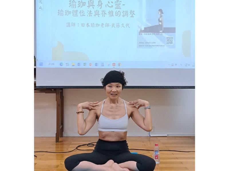 南華大學以自然瑜珈課程引領身心平衡,邀請武藤久代老師蒞校指導,講解瑜珈體位法。