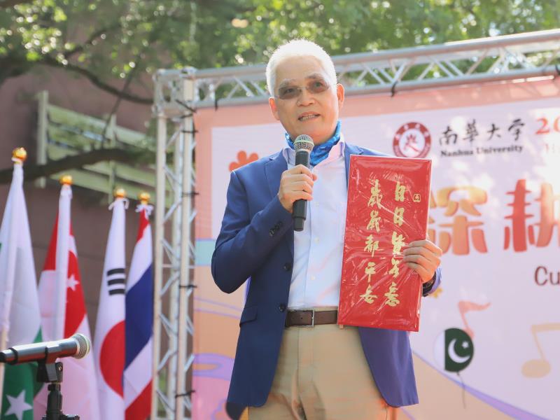 南華大學駐校董事覺禹法師致詞時指出,在高俊雄校長帶領下,校園氛圍愈加活絡,朝氣蓬勃。透過國際藝文節,除了讓大家瞭解到有哪些國家的學生來南華就讀,同時也能暸解各國文化與美食,藉由文化的交流,讓來自世界各地的國際生在南華找到家的感覺,這也是創辦人星雲大師對於國際生的關懷與最慈悲的體現。佛光山非常強調國際化,並擁有豐富的國際資源,期許南華大學未來在國際招生上更加拓展、再創佳績。覺禹法師也特別感謝許有疆鎮長及現場各位貴賓的支持與協助,相信南華大學將能為大林鎮創造更大的發展效益。