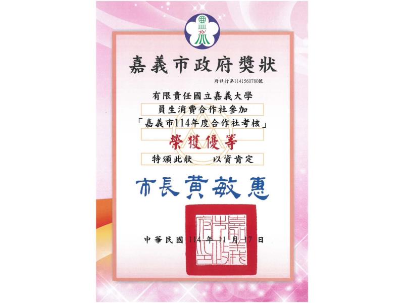 圖4:嘉大員生消費合作社榮獲嘉義市114年度合作社考核優等。