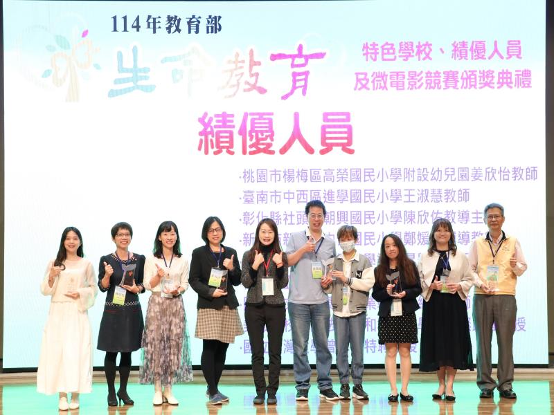 為表揚致力推動生命教育工作表現卓越且具特色之公私立各級學校、績優人員及生命教育微電影獲獎團隊,教育部於12月12日辦理「114年教育部生命教育特色學校、績優人員及微電影競賽頒獎典禮」,藉以肯定結合多元宣導與跨域合作,將生命教育從校園推展至社會各角落的獲獎者。本次分別有9位績優人員及8所特色學校(包括大專校院3所、高級中等學校1所、國中1所及國小3所)獲獎,並於當天揭曉微電影得獎團隊,此次競賽共計33件參賽、16部入圍影片角逐金牌獎座。