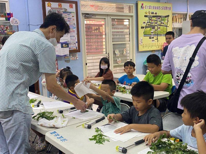 圖1:嘉義大學景觀學系王柏青主任率領團隊至彰化縣湳底社區課後輔導班指導「槌染」藝術創作。