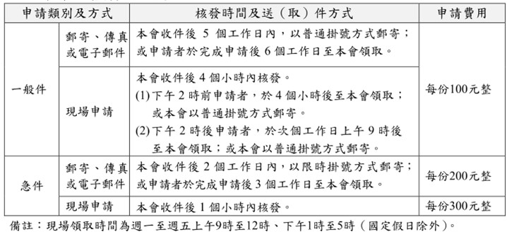 若申請一般件,約5個工作日,現場申請則4個小時內核發;若申請急件,則2個工作日以限掛郵寄,現場申請則1個小時內核發。