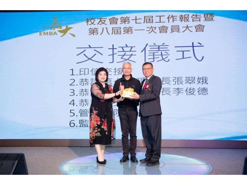 嘉義大學管理學院EMBA校友會12月13日盛大舉行第八屆第一次會員大會暨理事長交接典禮,現場冠蓋雲集、氣氛熱絡。嘉大陳瑞祥副校長、管理學院李永琮院長、沈宗奇副院長及 EMBA張淑雲執行長等學校代表親臨祝賀,與歷屆理事長、理監事及各屆校友齊聚一堂,共同見證校友會會務傳承的重要時刻。典禮中,新任理事長李俊德自第七屆理事長張翠娥手中接下象徵責任與使命的印信,正式領航第八屆校友會團隊,開啟嶄新篇章。