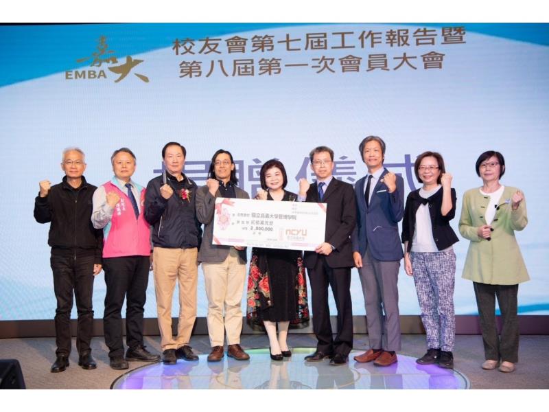 圖2:嘉大 EMBA 校友會展現強大凝聚力與對母校的深厚情感,由理事長張翠娥代表全體校友,捐贈新臺幣 200 萬元挹注管理學院「校友給力 AI 夠力」募款計畫,期盼透過經費支持優化教學環境與 AI 資源。