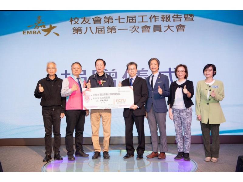圖3:嘉大校友總會理事長張永霖(左3)個人捐贈新臺幣 20萬元挹注管理學院發展,張理事長長期關心母校事務,其飲水思源的企業家精神,為全體校友樹立了最佳典範。