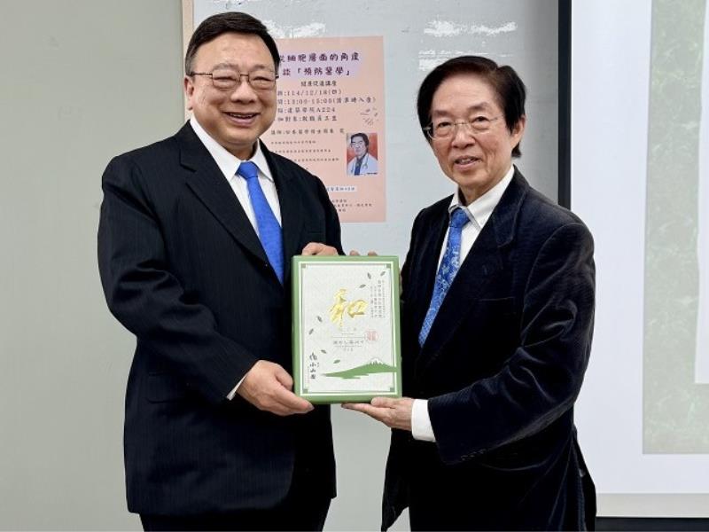 ▲日本醫學博士周東寬(右)致贈紀念品予中華大學校長劉維琪(左),象徵國際健康教育交流合作。