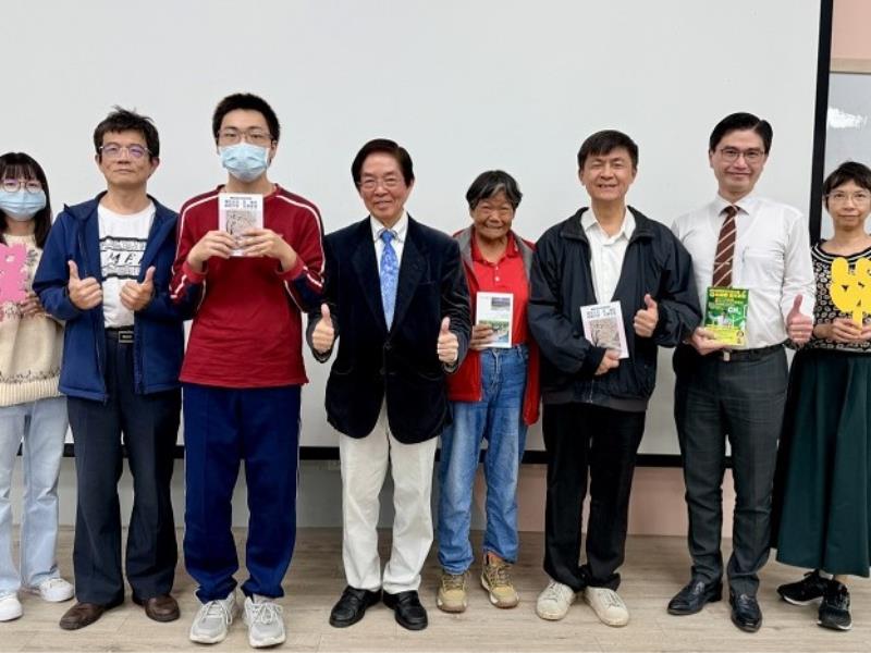 ▲(左起)畫家張秋臺、編曲家陳友佳、校長劉維琪及周東寬博士與師生合影,共同推動健康促進理念。