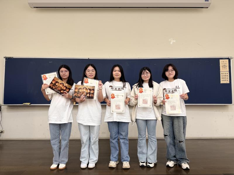 南華大學學生跨系組隊參加全國生成式 AI 大賽獲第三名,左2起為國際系四年級林芋廷、鄭蕙欣、文創系二年級陳思琪、國際系三年級陳靖尹、劉昀津。