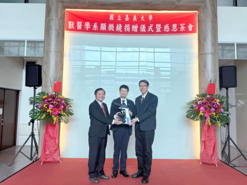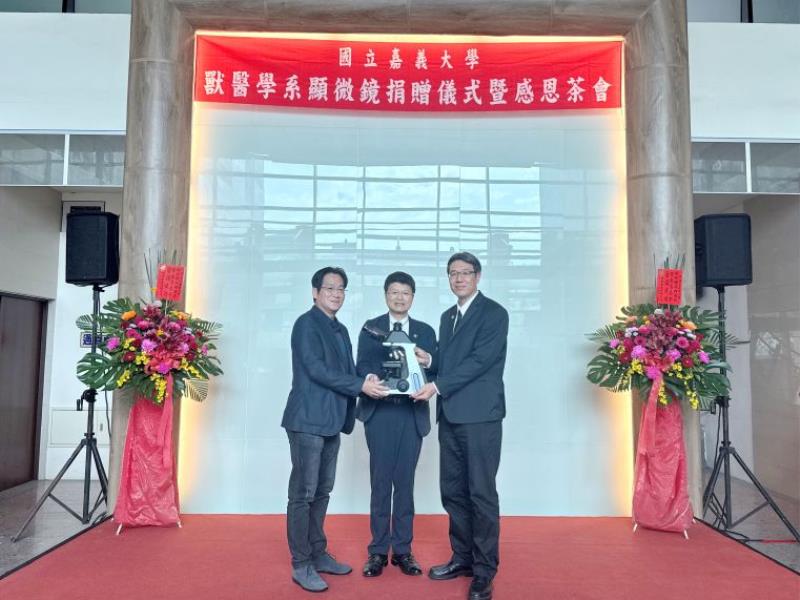 為提升嘉義大學獸醫學系教學設備與學習環境,培育兼具專業素養與社會責任感的獸醫人才,永鴻國際生技股份有限公司鍾威凱董事長、台灣維克法蘭斯股份有限公司動物保健處廖一名處長,攜手社團法人台灣嘉義大學獸醫校友會朱明泉理事長,12月19日在獸醫學系系館舉行光學顯微鏡捐贈儀式,共同捐贈30台光學顯微鏡,展現企業與校友長期支持高等教育與專業人才培育的具體行動。