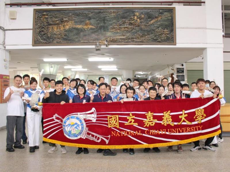 嘉義大學樂旗隊12月20日受邀參加2025嘉義市國際管樂節踩街嘉年華活動,林翰謙校長於樂旗隊出發前親臨勉勵,肯定隊員訓練成果,並致贈小禮物祝福演出順利,期許以精彩表現為校爭光,並由陳瑞祥副校長帶領校內主管及樂旗隊夥伴,自嘉義市中山噴水池圓環出發,沿途行進至KANO棒球園區,與國內外優秀管樂團隊齊聚嘉義市街頭,以充滿活力的音樂演奏與整齊劃一的行進隊形,為城市注入青春動感的藝術能量。此次踩街演出不僅展現學生社團的專業實力,也象徵嘉大長期深耕藝文教育、積極參與地方文化活動的成果。