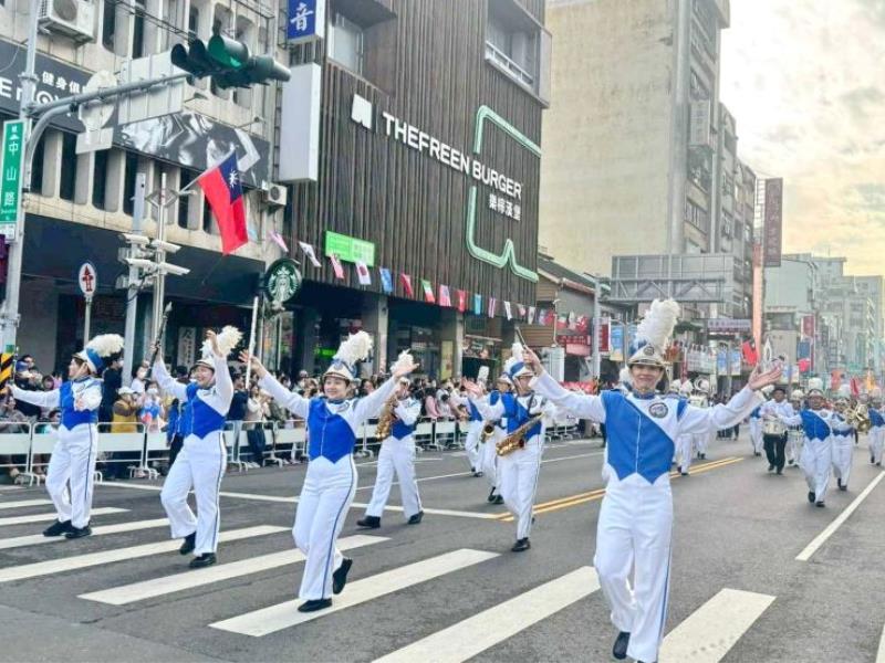 圖2:嘉大樂旗隊於2025嘉義市國際管樂節踩街演出,曲風橫跨流行與搖滾,兼具熱鬧氛圍與高度辨識度。