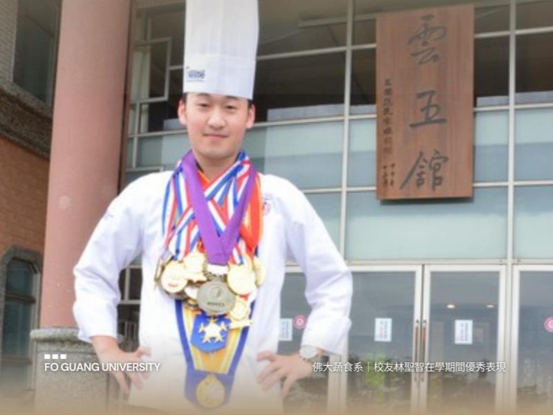 林聖智為蔬食系首屆畢業校友,就學期間即展現亮眼實力,學生時期參與超過 72 場國內外餐飲競賽,累計榮獲 63 項廚藝競賽獎項,其中包含 48 面金、銀、銅牌,並曾奪下國際素食賽事「菩提金廚獎」冠軍,創下佛光大學餐飲競賽史上具代表性的紀錄,堪稱蔬食系的標竿人物。