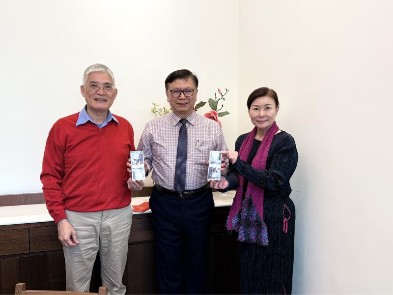 高俊雄校長(左)代表學校接受陳勁教授(中)捐款,賴淑玲副校長(右)亦出席一同合影。