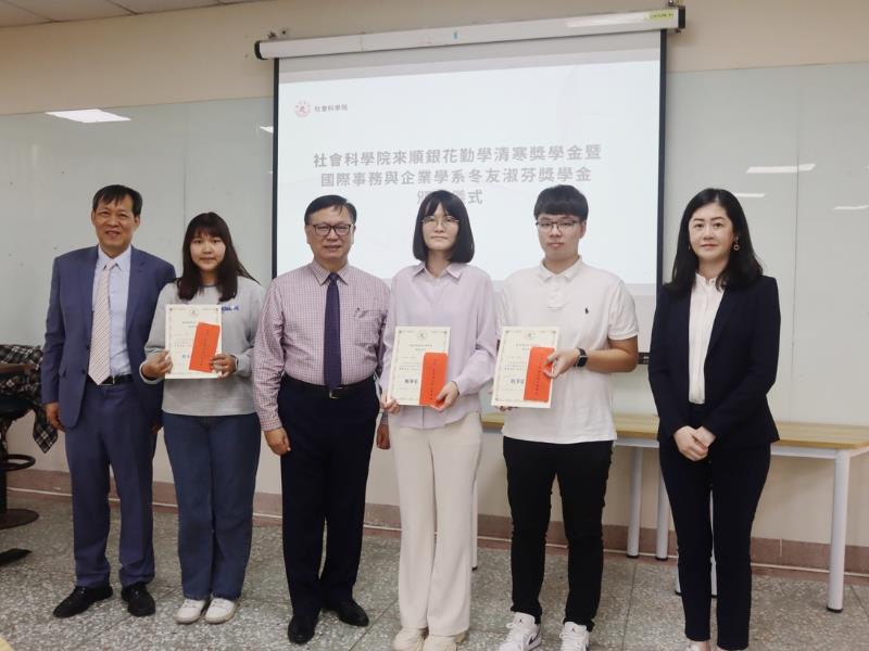 此次典禮重頭戲即為獎學金頒贈儀式,陸續頒發社會科學院「來順、銀花勤學清寒獎學金」,獎助對象涵蓋國際事務與企業學系、傳播學系及應用社會學系學生,鼓勵學生在克服經濟壓力之餘,仍能勤奮向學、持續精進。國際事務與企業學系「冬友、淑芬獎學金」,旨在鼓勵學生投入國際事務相關研究,提升專業知識與品格素養,彰顯學校長期推動國際化與社會實踐並重的教育理念。