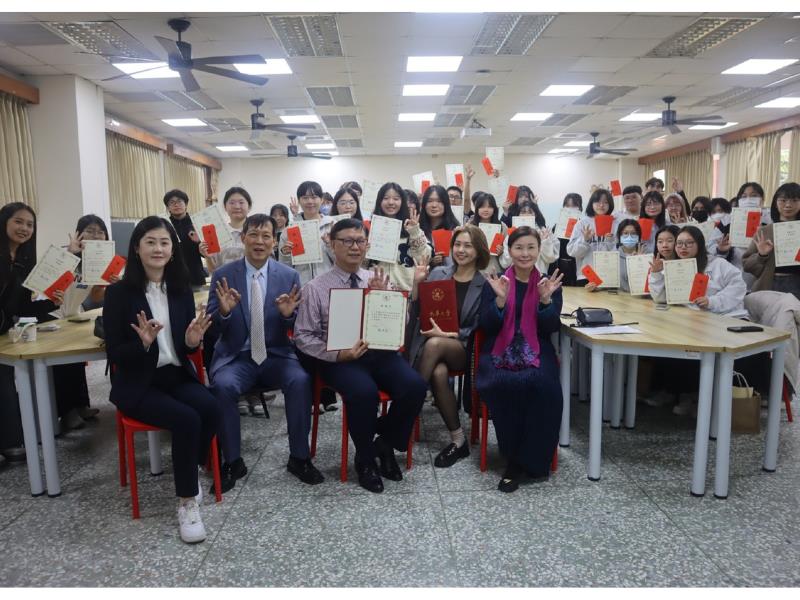 南華大學社科院與國際系頒發獎學金,獲「冬友、淑芬獎學金」之學生與師長合影。