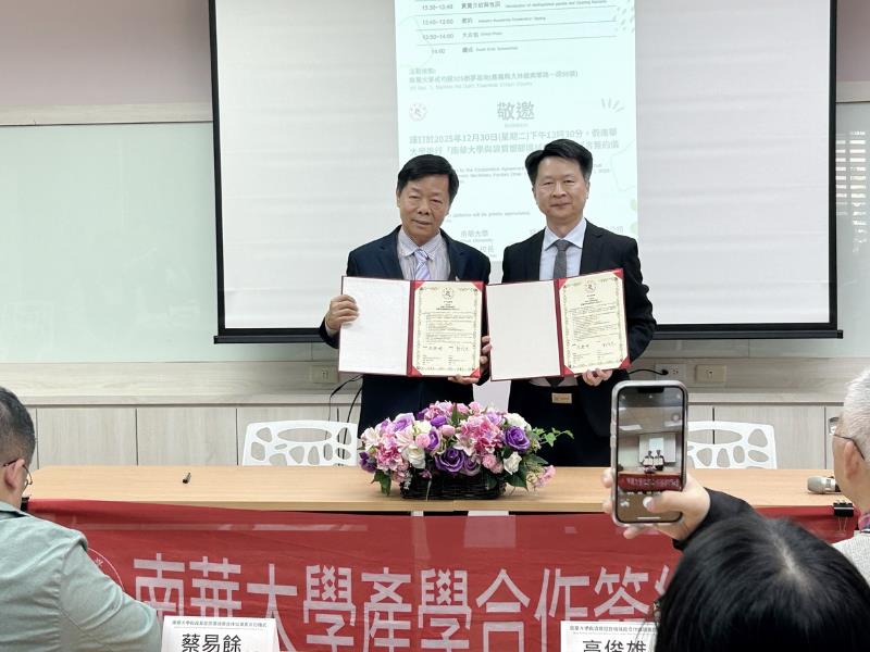 為推動循環經濟與永續農業發展,南華大學於12月30日下午舉行「南華大學與袋寶塑膠機械廠合作協議書簽約儀式」,正式與袋寶塑膠機械廠展開產學合作。雙方將以黑水虻循環經濟為合作核心,結合學術研究能量與產業實務經驗,共同探索農業廢棄物資源化與低碳處理技術之應用模式,為永續產業發展注入新動能。