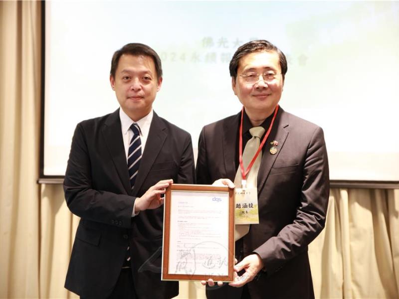 獨立第三方驗證機構 DQS 總經理陳勇任(左)授予佛光大學校長趙涵㨗(右)國際認證確信/保證(Assurance)證書。人間社記者佛光大學攝