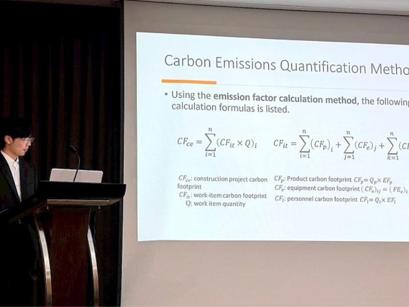 黃煒翔則分享,研究過程最大的挑戰是蒐集道路工程碳排數據,因資訊分散且缺乏標準格式,他花費大量時間訪談專業人員並進行多輪交叉驗證,最終成功將零散資訊轉化為系統化參數,並建立精準模型。「這段過程雖然艱辛,但讓我在國際發表時能自信回應提問,也更清楚自己的研究定位與未來方向。」