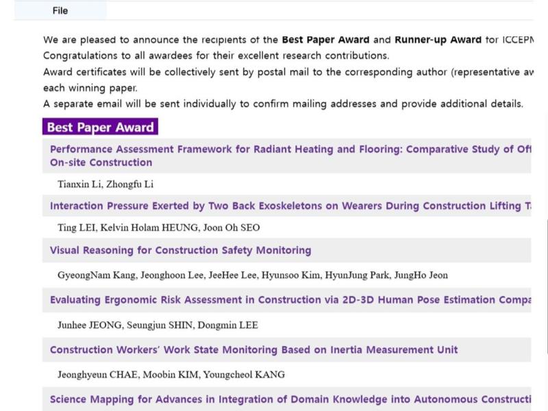 ▲ICCEPM 2025 官方公告:中華大學土木系研究榮獲 Runner-up Paper Award,深受國際肯定實力!