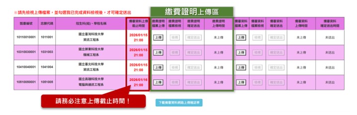 備審資料或體驗學習報告書,以及繳費證明上傳成功後,請按「下載體驗學習報告書或備審資料網路上傳確認單」,務必自行存檔妥善保存。日後若對備審資料上傳相關事項提出疑義申請時,須檢附此確認單作為備查。