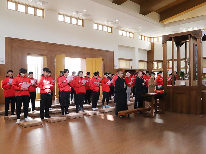 該校於1月2日下午舉行的賽前祈福儀式,由佛光山三好體育協會秘書長暨南華大學駐校董事覺禹法師親自主持,帶領校長高俊雄、學務長暨體育長何應志、棒球隊總教練蔡仲南、教練團以及選手們向佛陀獻燈祈福,並特別邀請來自印度目前就讀生死學系諮商組的四位法師一同恭讀《般若波羅蜜多心經》及創辦人星雲大師《為運動員祈願文》,為球隊加持,注入智慧與信心。