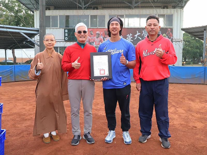 南華大學職棒校友陳鐿中(右2)捐贈十箱比賽用球回饋球隊,高俊雄校長(左2)致贈感謝狀。左1為南華大學駐校董事覺禹法師,右為蔡仲南總教練。