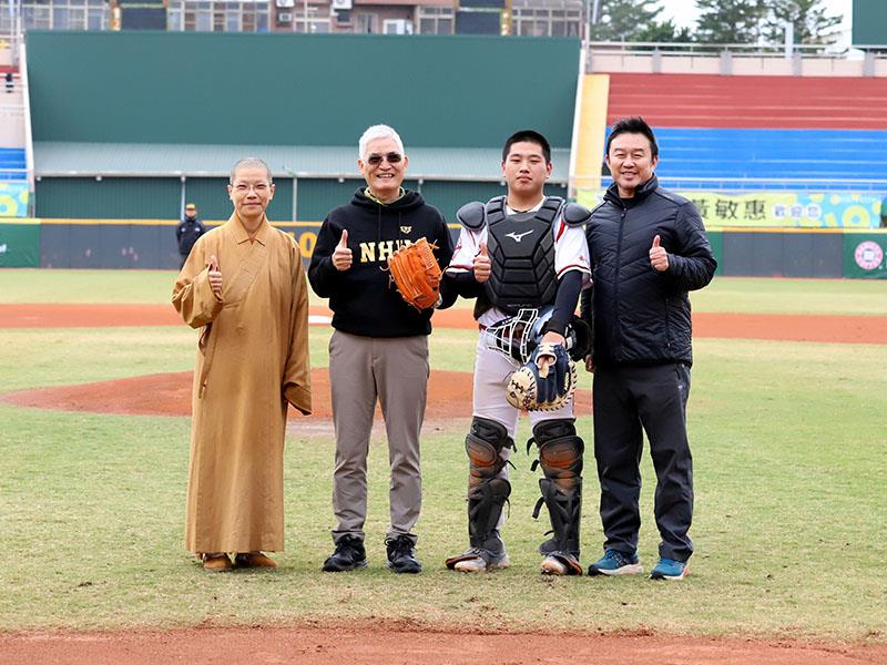 南華大學高俊雄校長(左2)受邀為大專盃棒球聯賽公開一級八強複賽開球,駐校董事覺禹法師(左1)與學務長暨體育長何應志(右1)也一同合影留念。
