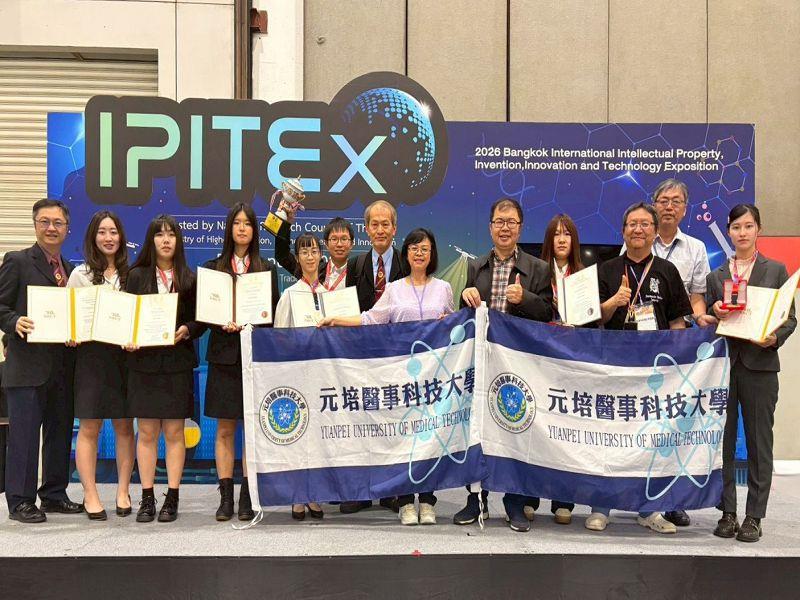 元培醫事科技大學師生團隊參加2026 曼谷國際發明展,在來自全球數百件優秀作品的激烈競爭中,憑藉醫療跨域整合AI技術、及智慧照護寵物保健創新,一舉斬獲3金、2銀、1銅及1項「大會傑出發明與創新特別獎」,展現傲視國際的研發動能與醫事教育實力。