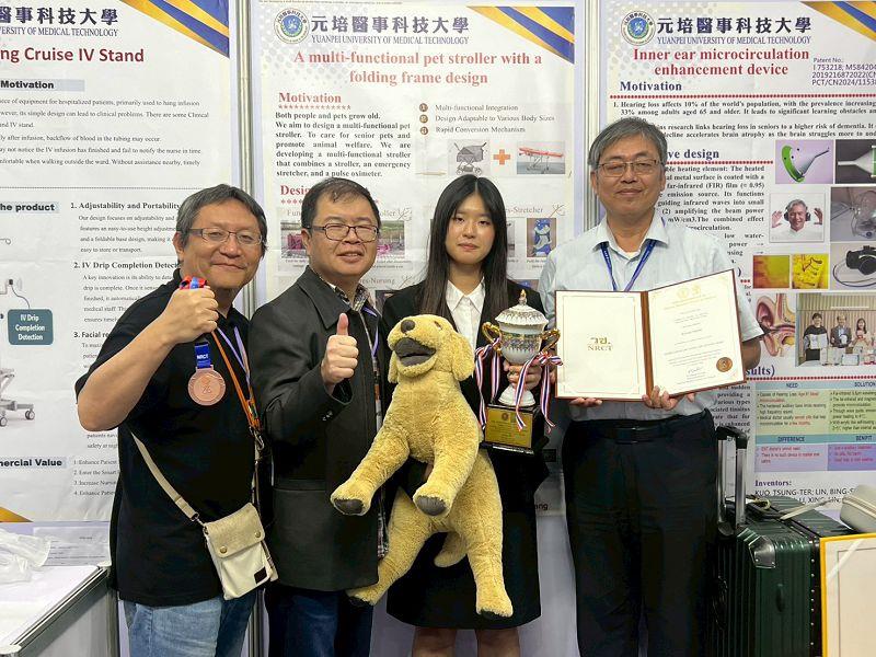 除了專業醫材,元培師生也將研發觸角延伸至智慧護理與寵物照護,護理系、醫放系、資訊管理系師生跨域協作的「警示巡航點滴架」,整合AI技術,能即時監控患者情緒與生理需求,有效減輕第一線護理負擔;醫放系、寵物保健系合作的「寵物保健中草藥研發」,透過食療科學改善毛孩泌尿系統健康,都獲得銀牌獎肯定。寵保系、資管系合作「多功能寵物推車」,具備擔架與推車四合一功能,專為高齡犬照護設計,提升居家救治效率,也獲得銅牌獎。