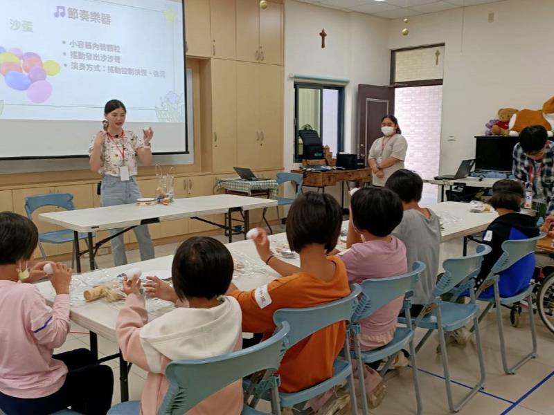 南華大學民音系師生以藝術走入安仁家園陪伴偏鄉兒少,辦理「當我們童在一起」主題工作坊,並教導學童認識節奏樂器。