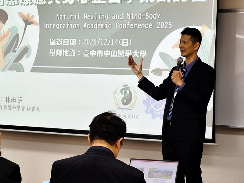 由中華國際自然醫學學會主辦,南華大學科技學院、南華大學自然醫學研究中心、南華大學自然生物科技學系自然療癒碩士班共同承辦,並由南華大學生命教育中心協辦之「2025自然療癒與身心整合學術研討會」,於日前在中山醫學大學正心樓舉行。本次研討會以「自然療癒與身心整合」為核心主軸,吸引來自醫學、自然療癒、教育、心理與健康科技等領域之學者與實務工作者齊聚一堂,透過跨領域學術交流,共同探討身心健康促進的多元策略與未來發展。