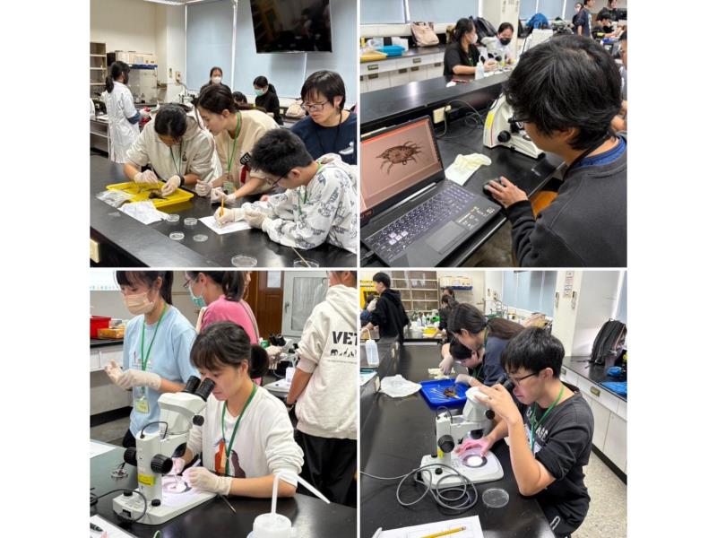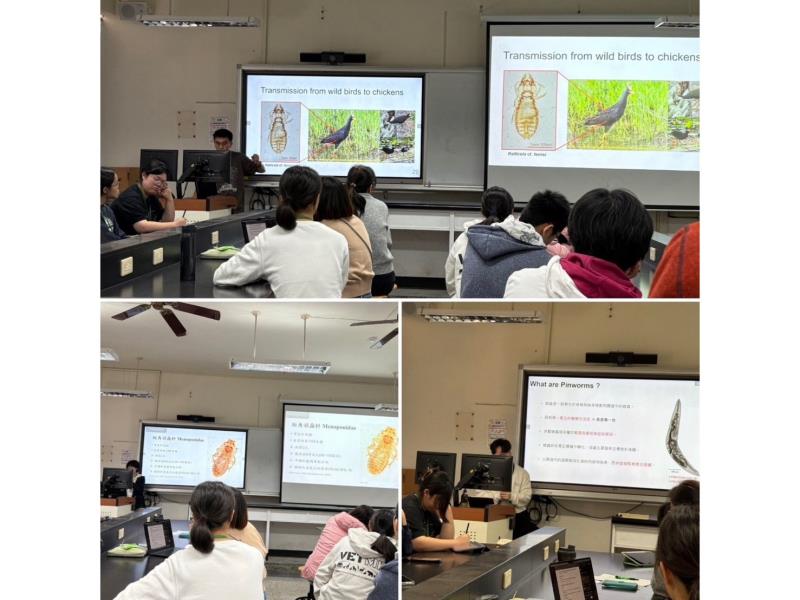 圖1:嘉大舉辦野生動物寄生蟲工作坊邀請到臺大邱名鍾助理教授研究室師生報告禽類羽蝨寄生蟲(上、左下圖)及昆蟲寄生蟲(右下圖)研究。