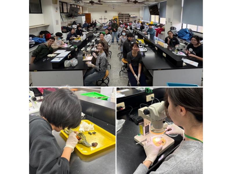 在實作課程中,學員親自進行鳥類、魚類、兩棲類及爬蟲類等多種野生動物的解剖觀察,學習辨識體外、體內及腸胃道寄生蟲。值得一提的是,課程所使用的動物樣本多來自各地志工團體移除的外來入侵物種,例如泰國鱧、斑腿樹蛙、亞洲錦蛙、綠鬣蜥、白腰鵲鴝及亞洲輝椋鳥等,使被移除的外來物種得以轉化為教學與研究素材,兼顧學術研究與生態教育意義。