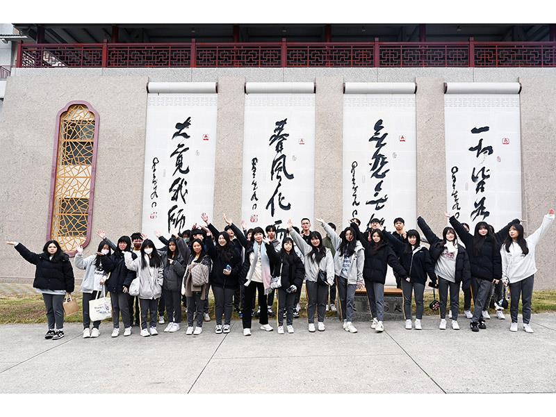 南華大學舉辦校園走讀活動,高中生在創辦人星雲大師一筆字牆前合影留念