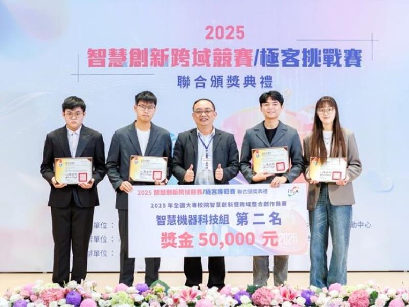 圖4:嘉大電機系張慶鴻教授及應化系黃正良教授指導電機系學生團隊榮獲「2025 智慧創新暨跨域整合創作競賽」第二名,展現跨領域合作的豐碩成果。