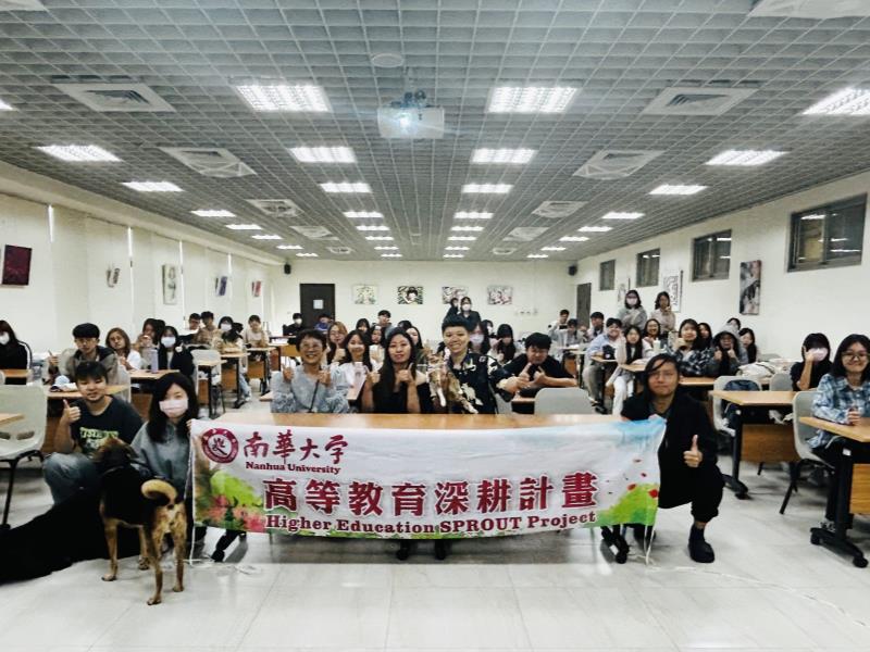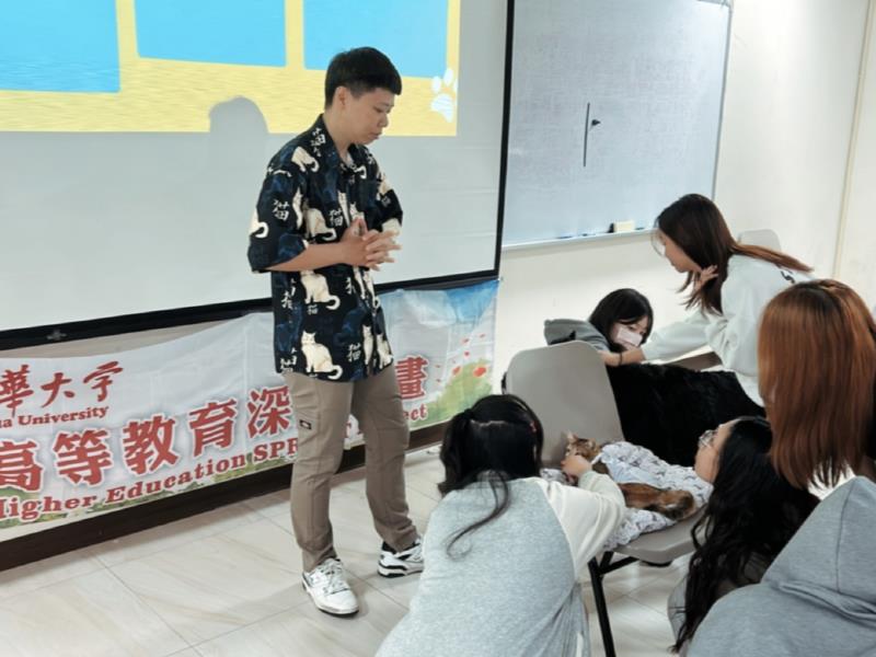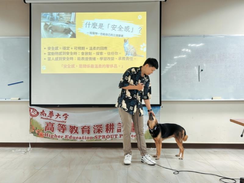 圖04.南華大學藝術與設計學院開設院跨領域課程「寵物行銷」,並邀請「米克斯寵物友善空間」經營者陳靖渝蒞校分享經驗,鼓勵學生與寵物互動。