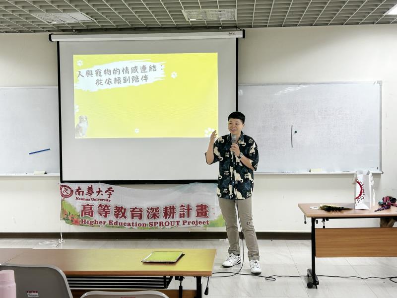 圖01.南華大學藝術與設計學院開設院跨領域課程「寵物行銷」,並邀請「米克斯寵物友善空間」經營者陳靖渝蒞校分享實務經驗。