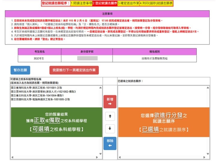 登入後,請先確認個人資料、報名組別,以及錄取校系組或學程名稱及正、備取名次等,是否正確無誤。仔細閱讀注意事項後,點選左側可選填的志願,按下「新增」,即可將想就讀的志願選至右方;按下「↑」或「↓」即可移動排列就讀志願序。若點選右側已選填的志願,按下「移除」,則可移除志願。