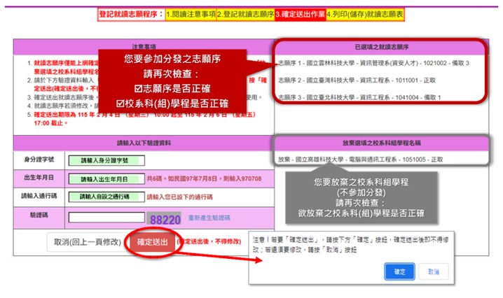 進入「確定送出作業」頁面後,請再次詳細閱讀注意事項。確認所選填的、放棄的志願序無誤後,即可輸入驗證資料並按下「確定送出」。如須修改請按「取消(回上一頁修改)」,可回上一步驟修改就讀志願序。