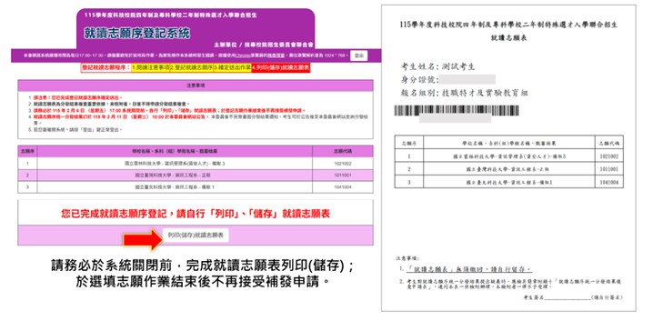 就讀志願序送出完成後,請按下「列印(儲存)就讀志願表」,並妥善保存。系統關閉後,將不再提供列印(儲存)功能,故請務必於115年2月6日17:00系統關閉前,完成就讀志願表的列印或儲存。