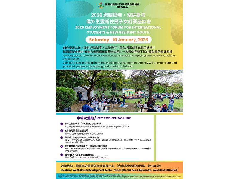 隨著台灣面臨產業轉型與勞動力結構改變的挑戰,如何延攬並留住具備多元背景的國際青年人才,已成為社會發展的關鍵課題。臺南市國際新住民關懷發展協會(TINRCDA)為了協助留台學子與新住民家庭順利銜接台灣職場,將於1月10日下午一點三十分在雲嘉南分署青年職涯發展中心舉辦「跨越限制,深耕臺灣—2026 僑外生暨新住民子女就業座談會」,南華大學尤努斯社會企業中心(NHU YSBC)為落實尤努斯願景,活化本國勞動力市場,亦參與協辦,期盼能有效解決國際人才在台尋職時所面臨的各項瓶頸,吸引並留住在台受教育的國際人才,達成社會企業精神的重要一環。   該活動主辦單位臺南市國際新住民關懷發展協會理事長邱蕙君指出,許多在台求學的僑外生及新住民二代擁有多語言優勢與跨文化理解力,卻常因不熟悉繁瑣的法律程序或就業規定而與理想的工作機會失之交臂。因此,協會希望能透過此座談會,串連學術界與政府資源,協助這群優秀的國際青年在台灣紮根,促進台灣產業發展。   座談會將針對「僑外生留台就業評點制度」提供完整的法規解析,協助參與者釐清工作許可申請、居留權益以及「有戶籍」與「無戶籍」身份在法律上的差異。此外,針對畢業後尋職期的延期居留規定,現場將邀請企業代表與政府部門專家參與 Q&A 環節,也會提供具體的實務指導,讓雇主也能了解如何依法聘用並留住國際人才。   南華大學校長高俊雄表示,僑外生與新住民子女是臺灣產業發展與國際連結的重要人才,期盼透過本次座談會協助國際青年更加瞭解就業法規,並能順利接軌職場,高俊雄校長亦鼓勵校內僑外生及新住民子女踴躍參與,以提早為未來的職涯規劃做準備,為在臺深耕開創更多可能。   這場針對國際人才量身打造的就業輔導盛事將於1月10日週六下午一點三十分準時開始,地點位於臺南市中西區北門路一段 173 號。歡迎各大專院校的僑外生、港澳生、新住民二代以及有意招募全球人才的企業主踴躍參與,共同參與這場邁向在台深耕成功的重要聚會。