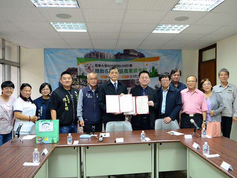 南華大學科技學院於4月1日與民雄鄉農會舉行合作意向書簽署儀式,雙方正式建立合作關係,未來將透過產學合作模式,共同推動在地農產品開發與推廣,提升農業附加價值,促進地方產業發展。 南華大學科技學院執行教育部114至116年大學社會責任實踐計畫(USR)「推動在地社區農業碳中和」,透過跨領域合作與場域實踐,結合學術能量與地方資源,推動農產品創新應用與產業鏈整合,協助地方農業轉型升級。 本次簽約儀式由南華大學科技學院院長陳柏青與民雄鄉農會理事長張永和代表簽署合作意向書,建立學術單位與地方農業組織之合作平台。未來雙方將透過產學合作研究及產品開發等方式,推動在地農產品多元應用與市場拓展,並結合USR計畫資源,協助開發與推廣特色農產品,如山葵醬條、油菊茶包等,提升產品附加價值與市場競爭力。 活動現場亦展示USR計畫與在地產業合作成果,包含農產品加工應用及特色伴手禮開發,呈現大學與農會攜手推動農業創新與產業升級之具體成效。