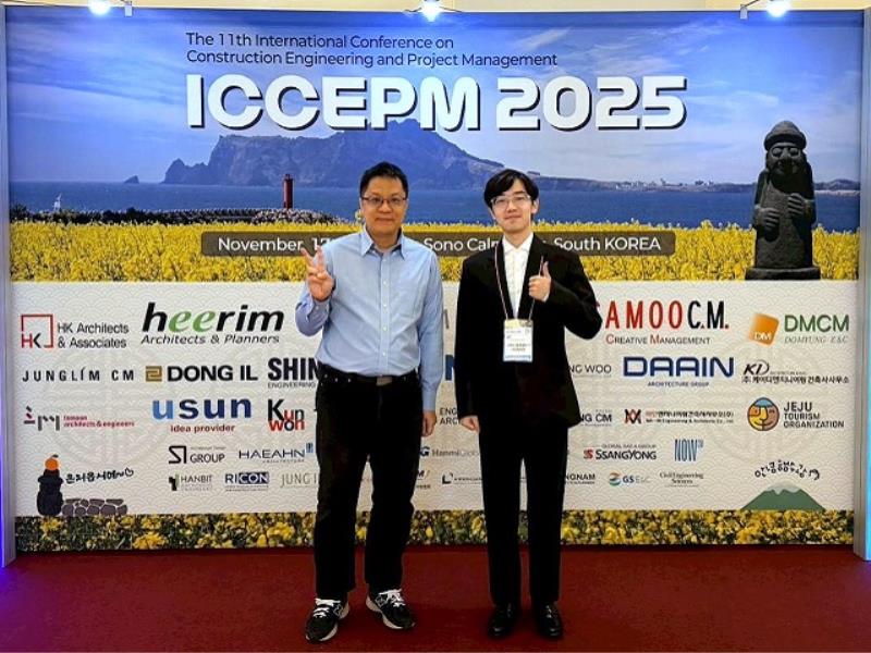 中華大學土木工程學系傳捷報!在周宏宇老師指導下,碩士生黃煒翔與博士生魏宇德赴韓國濟州參加「第11屆國際建設工程與專案管理研討會」(ICCEPM 2025),以道路工程減碳研究成果榮獲 Runner-up Paper Award,在全球103件投稿中脫穎而出,為校爭光,更肯定學生的專業實力。 魏宇德表示,這次國際交流讓他深刻體會學術與產業的連結,並啟發後續研究思路。「能在全球舞台分享成果,並獲得肯定,是對我們努力的最佳回報。我希望未來能將這套架構擴充至更多工程案例,讓研究真正落地,為淨零轉型貢獻力量。」