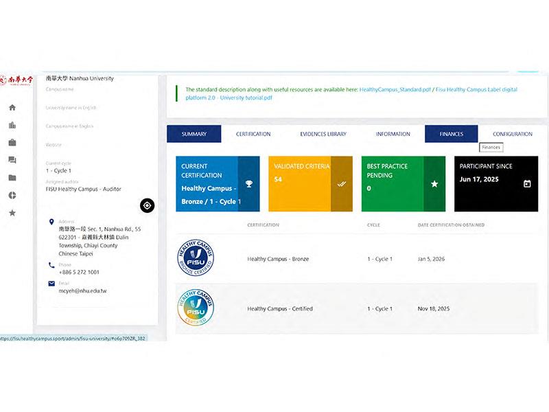 大學校園 南華大學接軌國際健康治理 榮獲FISU健康校園銅級認證